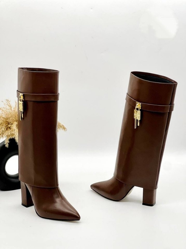 Kahverengi deri diz üstü çizme, parlak yüzeyli ve stiletto topuklu. Modern klasik görünüm için kemerli ve küçük kilit detaylı. Günlük kullanım için uygun.