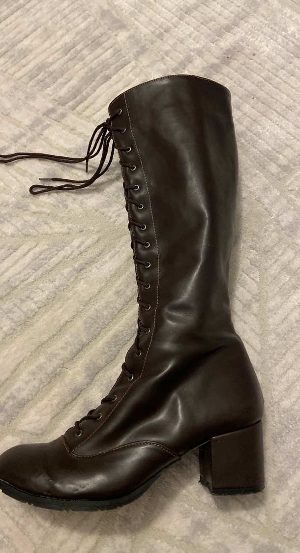 Kahverengi deri dizüstü bot, kürk detaylı ve blok topuklu, günlük kullanıma uygun gotik tarzda.