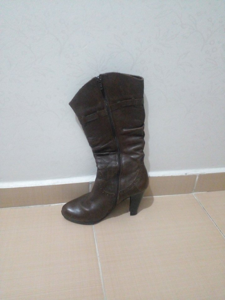 Kahverengi Deri Dizüstü Topuklu Kadın Çizmesi