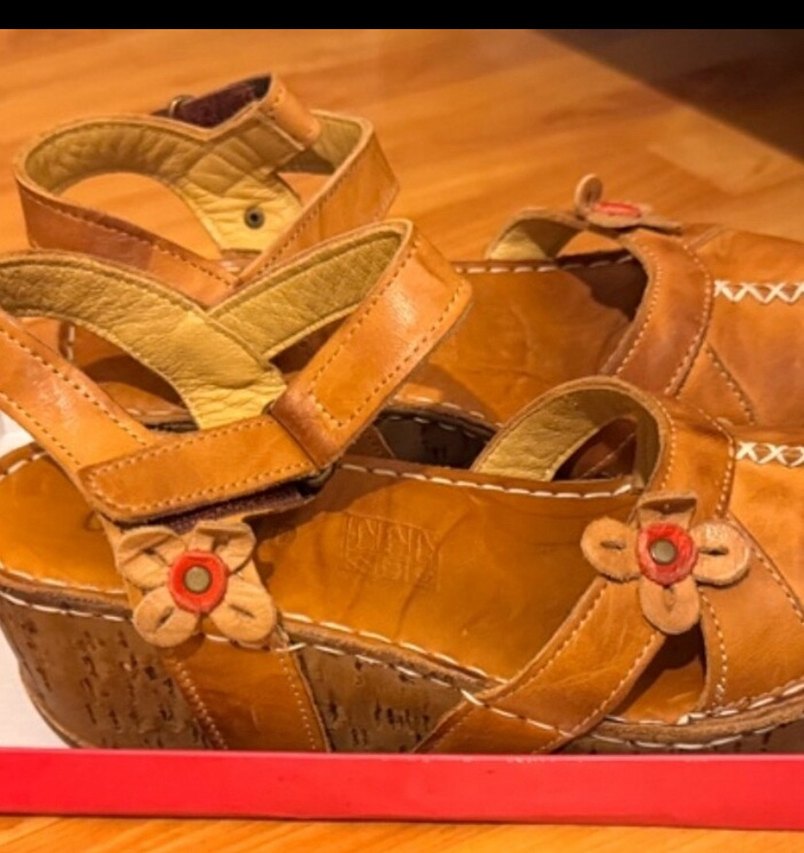 Kahverengi deri dolgu topuklu sandalet, çiçek detaylı ve tokalı bantlara sahip, vintage bohem tarzda romantik akşamlar için ideal. İki Üç kez giydiğim deri sandaletim detaylar fotolarda