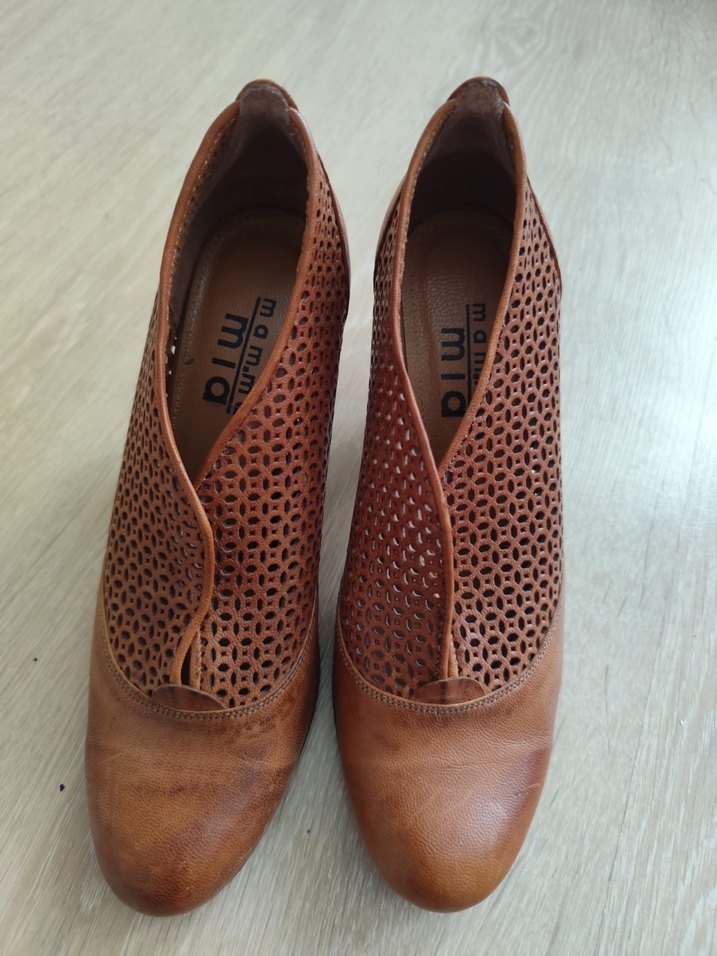 Kahverengi deri, dolgu topuklu kadın ayakkabısı. Delikli tasarım ve tokalı detaylara sahip, vintage bohem tarzda günlük kullanıma uygun.