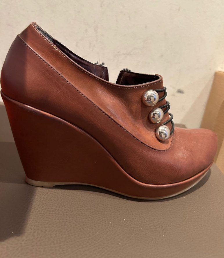 Parlak kahverengi deri kadın bot, dolgu topuklu ve tokalı detaylara sahip. Günlük kullanıma uygun çağdaş tarzda.Kullanılmış üründür.