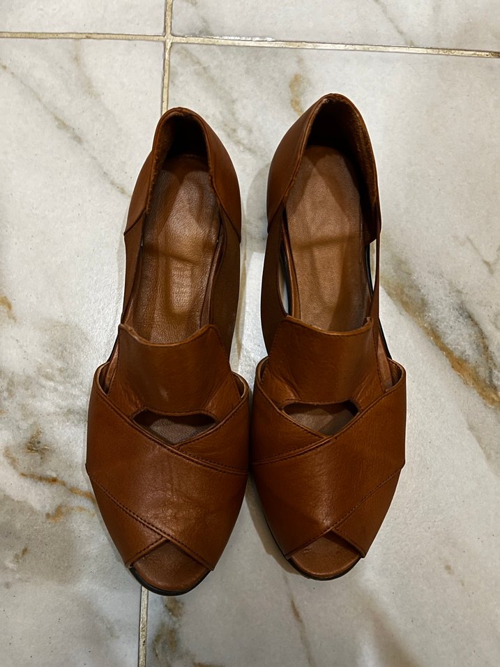 Kahverengi orijinal deri, hafif topuklu kadın sandalet. Minimalist ve çağdaş tasarımıyla günlük kullanım için uygundur. Rahattır yenidir hiç giyilmedi