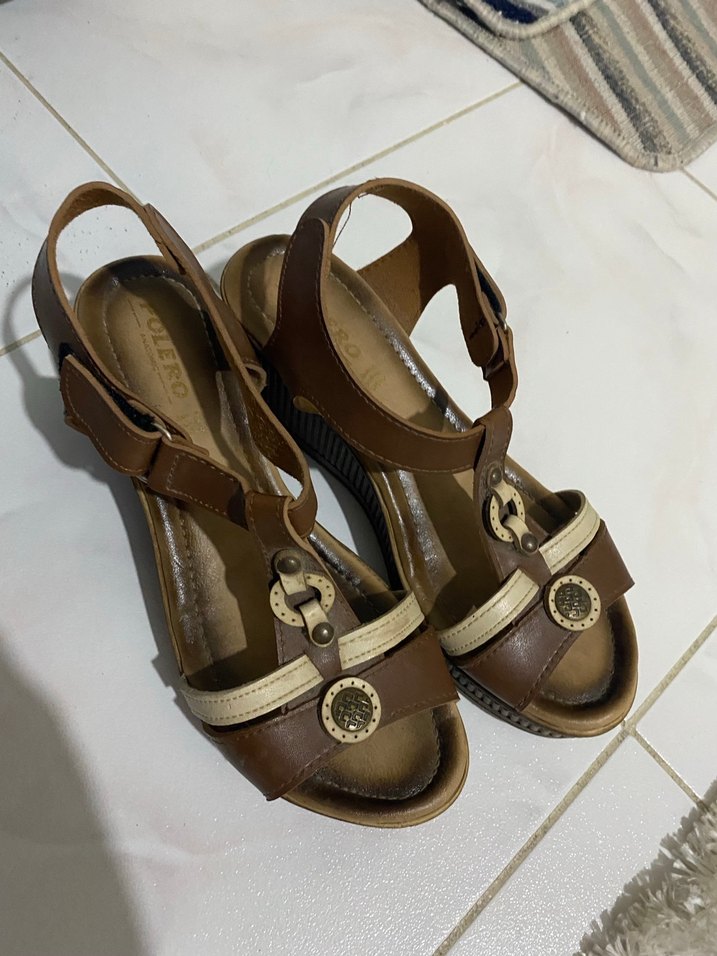Kahverengi Deri Dolgu Topuklu Kadın Sandalet
