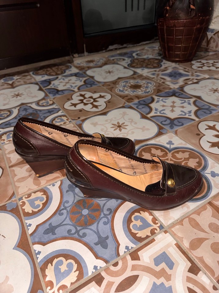 Kahverengi deri malzemeden yapılmış, dolgu topuklu ve tokalı klasik kadın ayakkabısıdır.