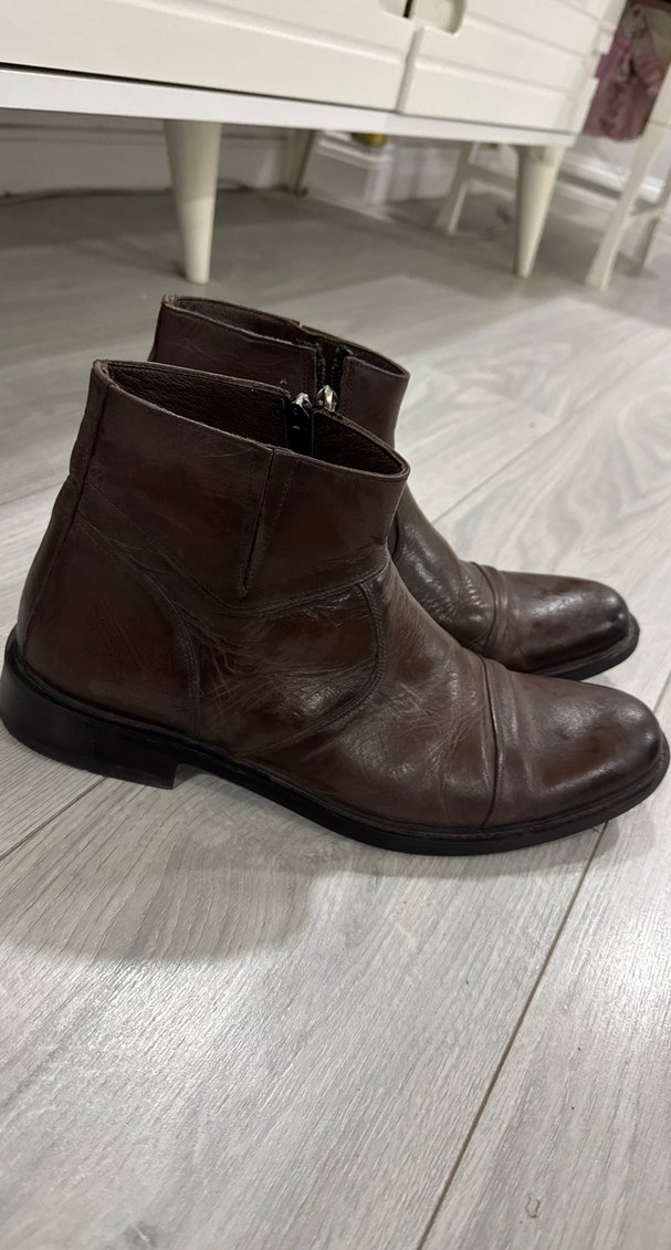 Koyu kahverengi deri erkek biker bot fermuarlı . Temiz ve yeni iki defa giyilmiş.