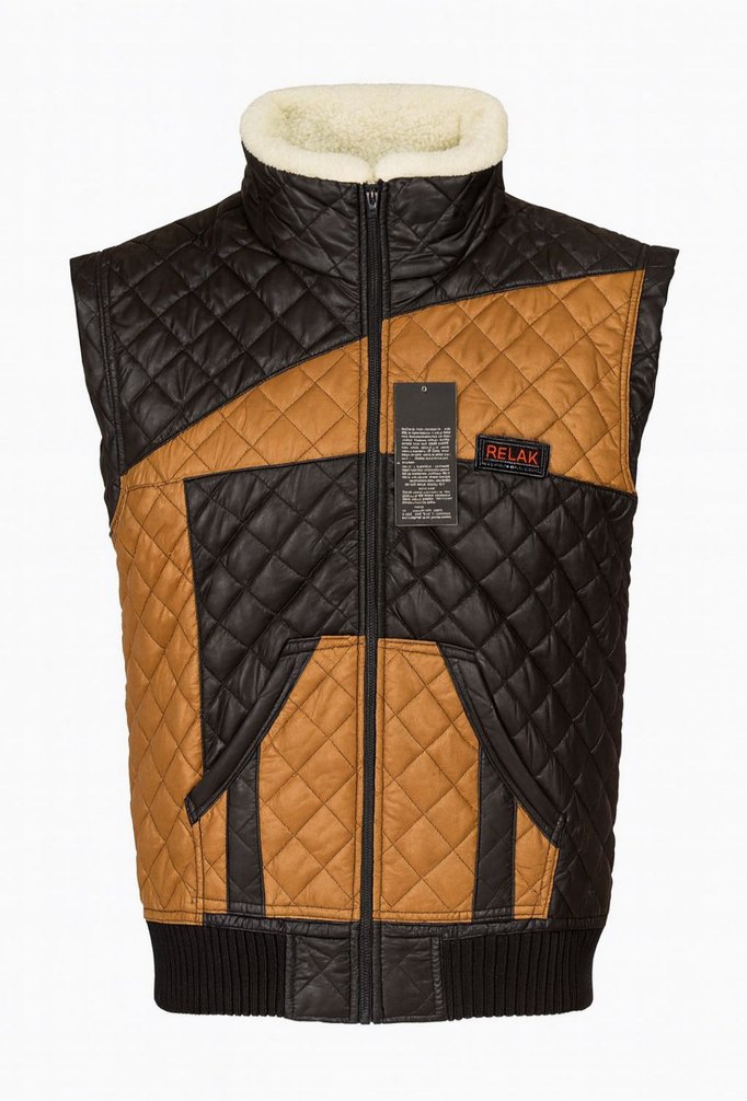 Kahverengi deri kaplamalı, kapitone desenli, kemerli ve kesik yaka detaylı, normal boyda erkek biker yelek. Rahat kesim, sokak stiline uygun.