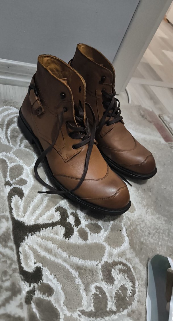 Kahverengi deri erkek botlar, tokalı ve bağcıklı detaylıdır. Günlük kullanıma uygun klasik ve koyu renkte rahat bir modeldir.