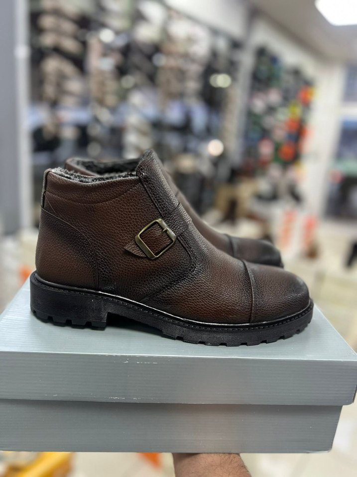 Tokalı kayışa ve dokulu yüzeye sahip kahverengi deri erkek botlar, sağlam tabanıyla sokak stiline uygun.
