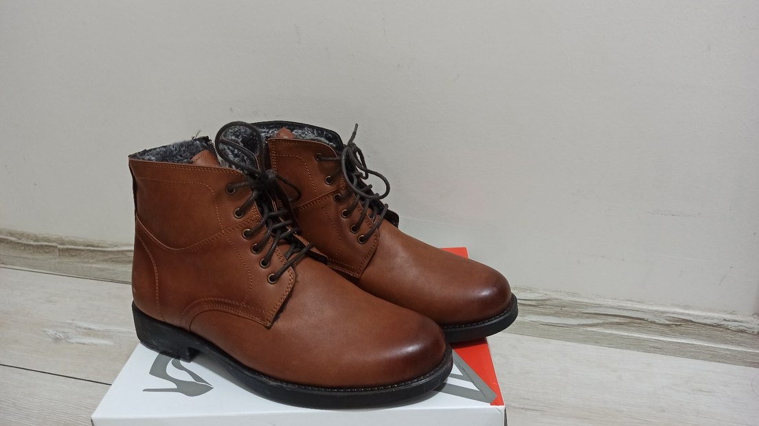 Parlak kahverengi deri erkek botları, içi yünlü geniş kalıp sıcacık, Sokak stili ve günlük kullanım için uygundur.
