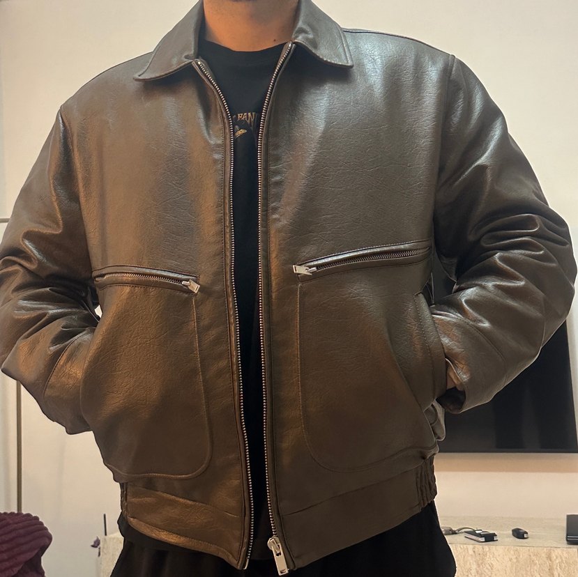 Kahverengi deri erkek ceket, çıtçıtlı yakalı ve fermuarlı ceplerle. Bol kesim, uzun kollu ve midi boyda, günlük kullanım için uygun.