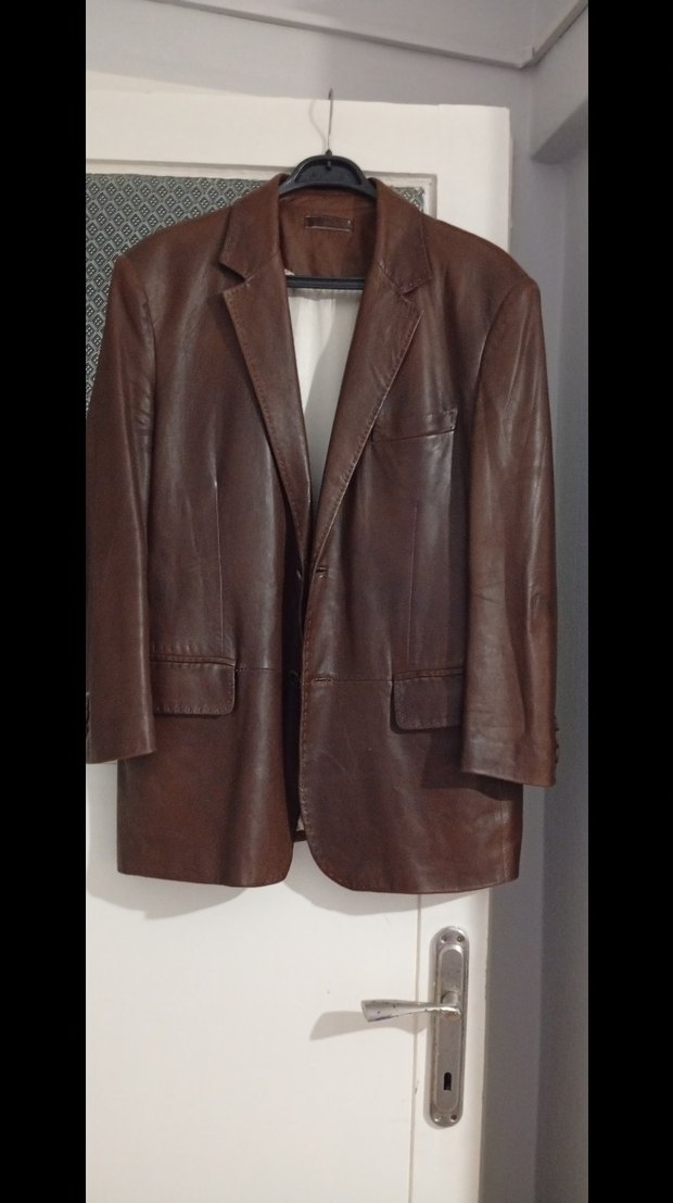 Kahverengi deri erkek ceket, kesik yaka ve düğmeli ön detaylarına sahiptir. Normal kesim ve uzun kolludur, ofis kullanımı için uygundur. Klasik, desensiz ve koyu renkli midi uzunluktadır.