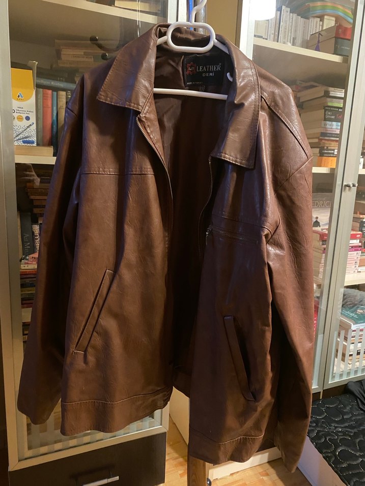 Kahverengi deri erkek ceket, yaka detaylı ve kemerli. Parlak yüzeyli, uzun kollu, midi boy ve sade tasarımlı, günlük kullanıma uygun. Sadece iç yaka kısmında deri çizgileri belirgin atması var başka kusuru yok bunu bilerek alın