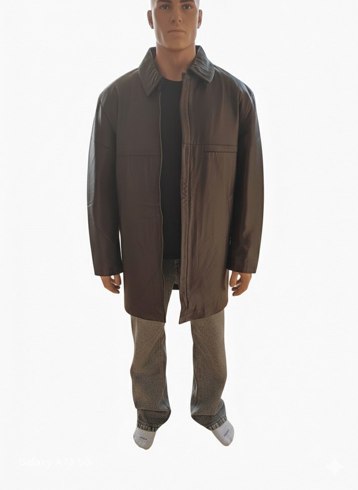 Kahverengi deri, kesik yakalı, uzun kollu, kemerli, midi boy, regular fit erkek ceket. Ofis kullanımı için uygundur.