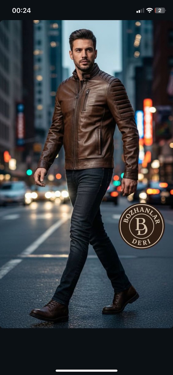 Kahverengi deri erkek ceket, yakalı ve uzun kolludur. Kemer detaylı, normal boyda ve regular fit kesime sahiptir. Günlük sokak stili için uygundur.