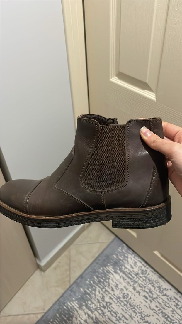 Kahverengi deri erkek Chelsea bot, elastik yan paneller ve tokalı detaylarla sokak stili için uygun.