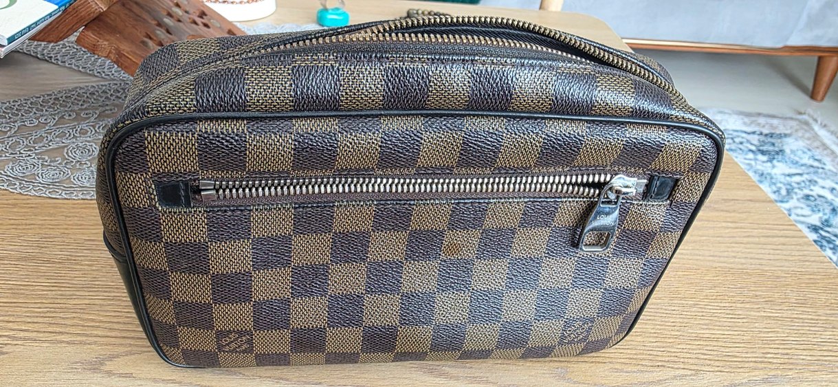 Kahverengi deriden yapılmış, koyu kare desenli ve fermuarlı erkek clutch çanta, modern klasik tarz ve Paris şıklığını yansıtıyor.