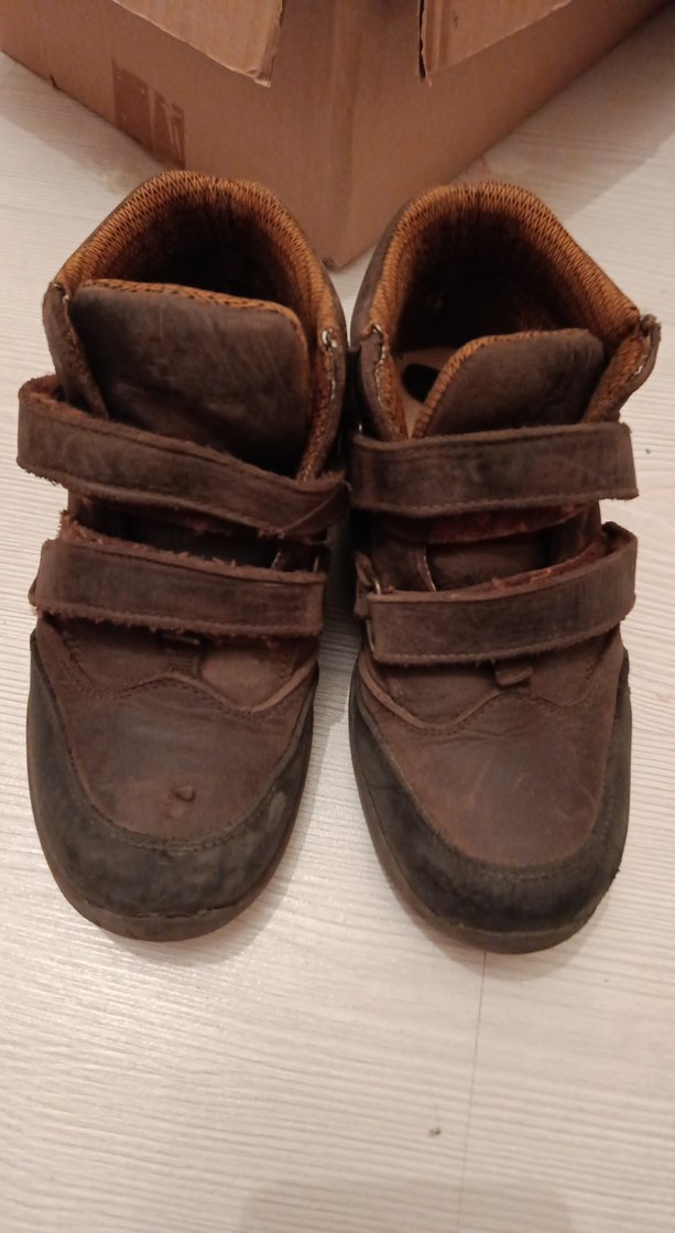 Tokalı, kahverengi deri erkek çocuk botları, sade desensiz ve kullanılmış görünüme sahip.