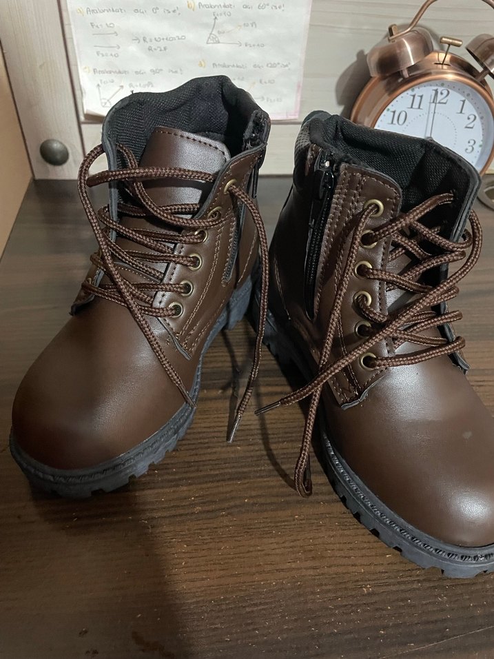 Koyu kahverengi deri erkek çocuk botu, tokalı ve bağcıklı, dayanıklı tabanlı ve kolay giyim için fermuarlı. Günlük kullanıma uygundur.