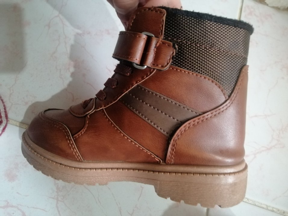 Kahverengi deri erkek çocuk botu, tokalı kayış ve parlak yüzeye sahip, sokak modasına uygun şık bir tasarım. Göründüğü gibidir herhangi bir deride çatlaklık yırtık vesaire hiçbir şey yoktur toplamda 3-4 kere ancak giyinmiştir belki o bile değil alana hayırlı olsun
