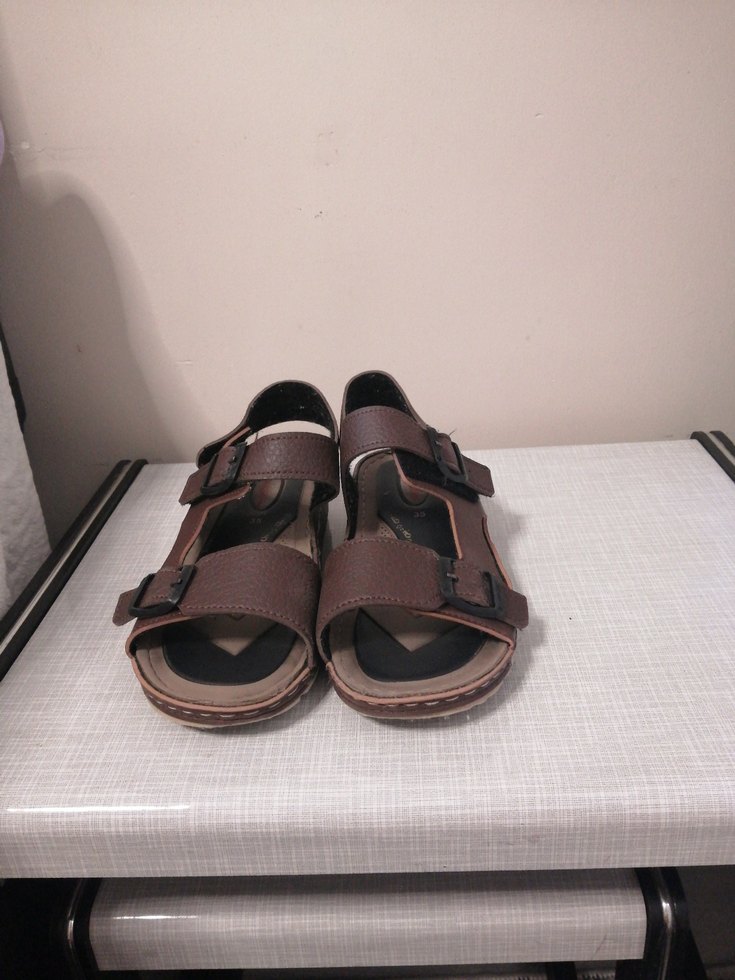 Kahverengi deri, Erkek sandaletler, minimalist ve çağdaş tasarım, günlük rahat kullanım için uygundur.