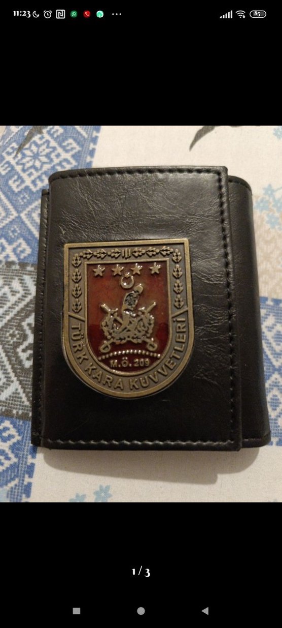 Kahverengi deri erkek cüzdanı, Türk Kara Kuvvetleri armalarıyla klasik ve sade bir tarz sunar.