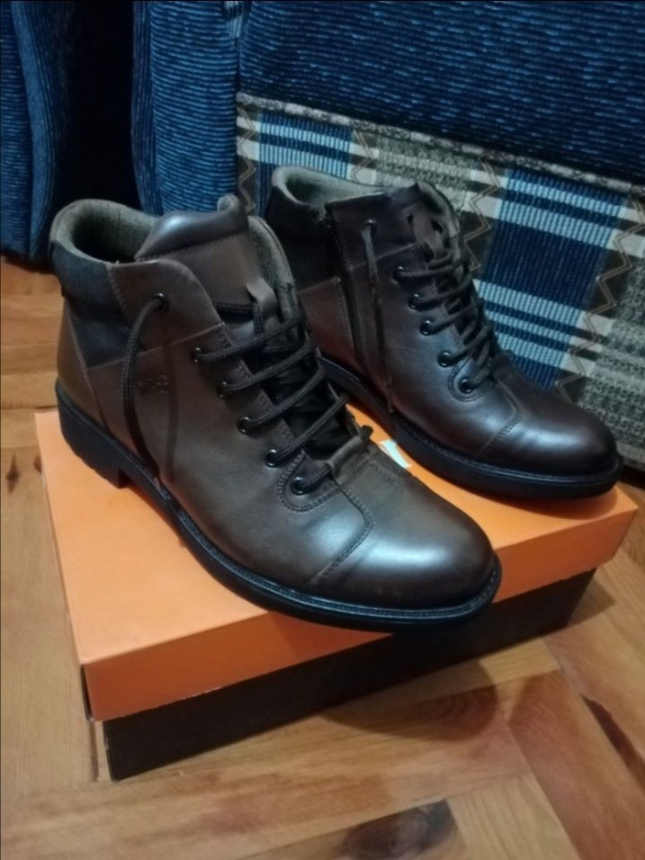 Kahverengi deri, kemerli erkek botları, günlük sokak giyimi için uygundur. Desensiz ve rahat tarzda.