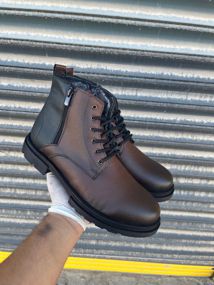 Koyu kahverengi deri erkek bot, bağcıklı ve yan fermuarlı, kemer detaylıdır. Sokak stiline ve günlük kullanıma uygundur.