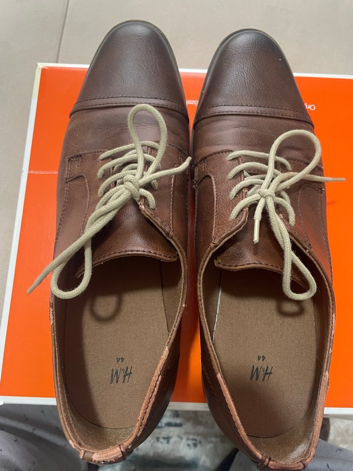 Kahverengi deri erkek klasik ayakkabılar, bağcıklı ve desensiz tasarıma sahip. Ofis kullanımı için uygundur. Numara 44.