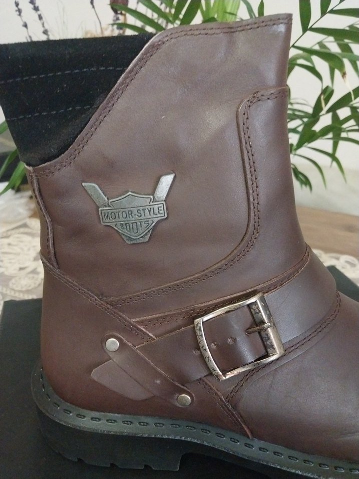 Koyu kahverengi deri erkek botları, tokalı ve desensiz tasarıma sahip, amblemi bulunur. ️