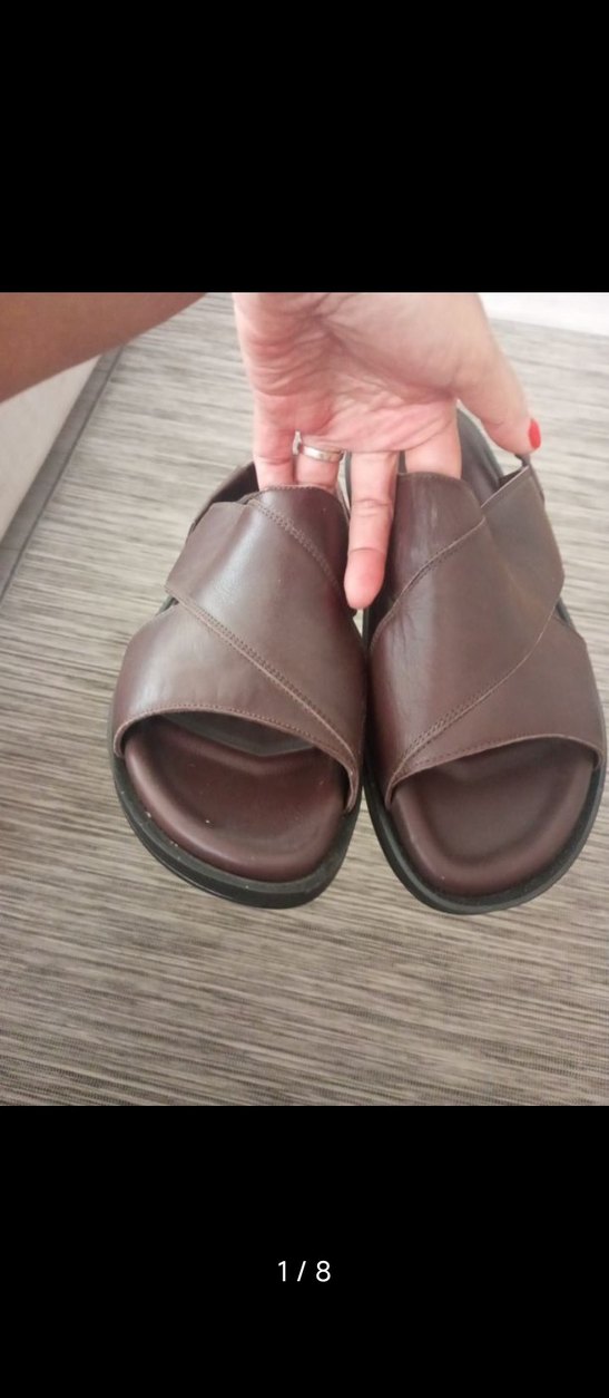 Kahverengi, deri erkek sandalet. minimalist ve klasik tarzda, günlük kullanıma uygun.