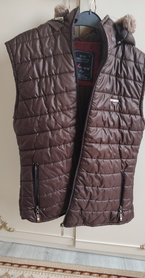 Kahverengi deriden üretilmiş, fermuarlı cepli ve kesimi vücuda oturan erkek yelek. Notlu yakaya sahip, günlük rahat sokak stili için uygun.