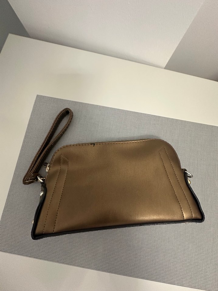 Kahverengi deri, fermuarlı ve bilek askılı kadın çantasıdır. Desensiz, klasik zarafeti yansıtan çağdaş Paris tarzında, günlük kullanıma uygundur.