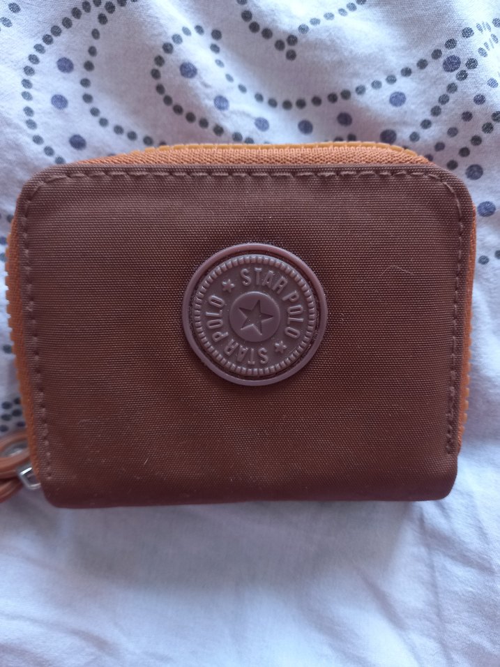 Kahverengi deri kadın cüzdan, fermuarlı kapanış ve baskılı logo detayı içerir. Minimalist ve gündelik şık tarz için uygundur.