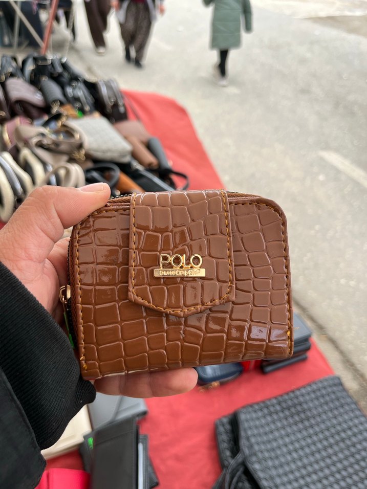 Kahverengi deri, fermuarlı kadın cüzdanı, yılan derisi desenli ve POLO markalıdır. Trendy günlük sokak stili için uygundur.