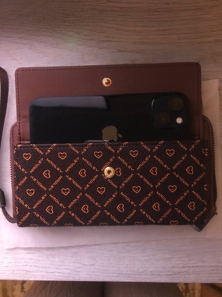 Kahverengi deri, fermuarlı ve baskılı kadın cüzdanı. Moda sokak tarzına uygun, çıtçıtlı kapaklı ve geniş iç hacimli.