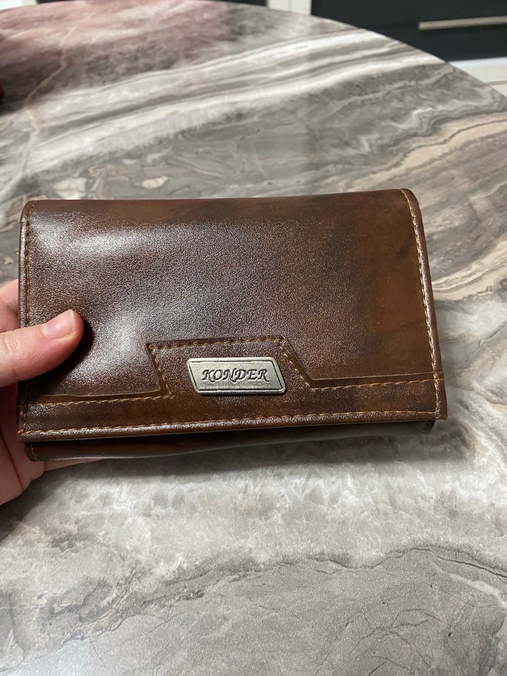 Kahverengi deri ve fermuarlı tasarıma sahip kadın cüzdanı. Parlak yüzeyli, vintage tarzda ve KOMDER markalı. Günlük kullanıma uygundur.