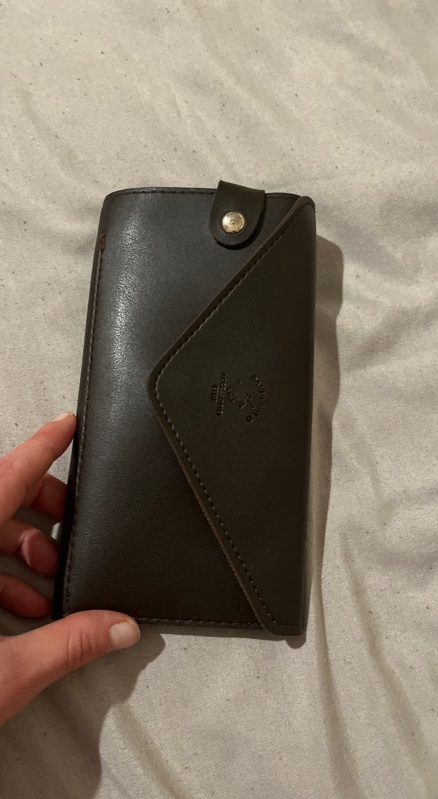 Koyu kahverengi deri kadın cüzdanı, fermuarlı kapanışlı ve minimalist biker tarzında, günlük kullanım için uygun.