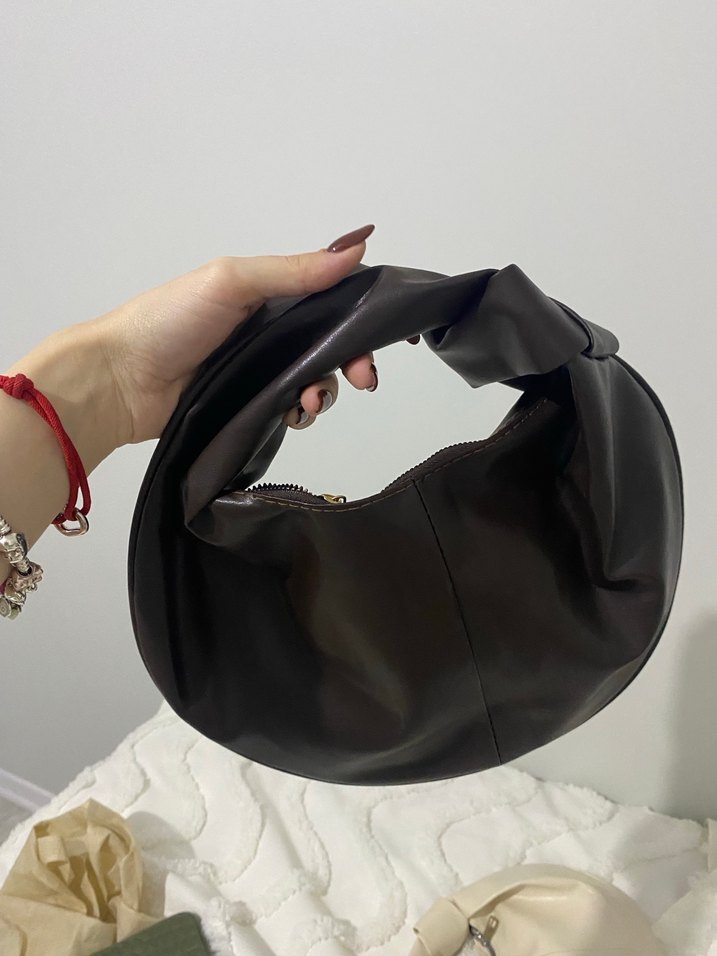 Kahverengi deri fermuarlı çanta, minimalist tasarımıyla günlük sokak stiline uygundur. Moda öncülerine avant-garde şıklığı sunar.