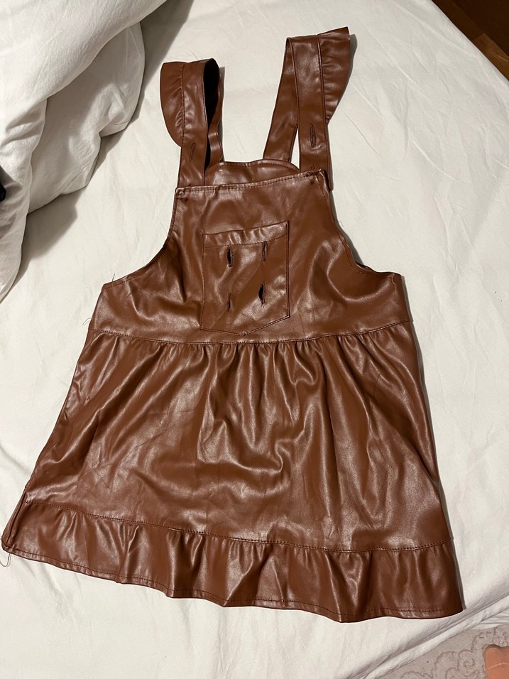 Geçişli askılı, fırfırlı kahverengi deri kısa tulum. Parlak dokusu ve salaş kesimiyle günlük sokak stiline uygun.