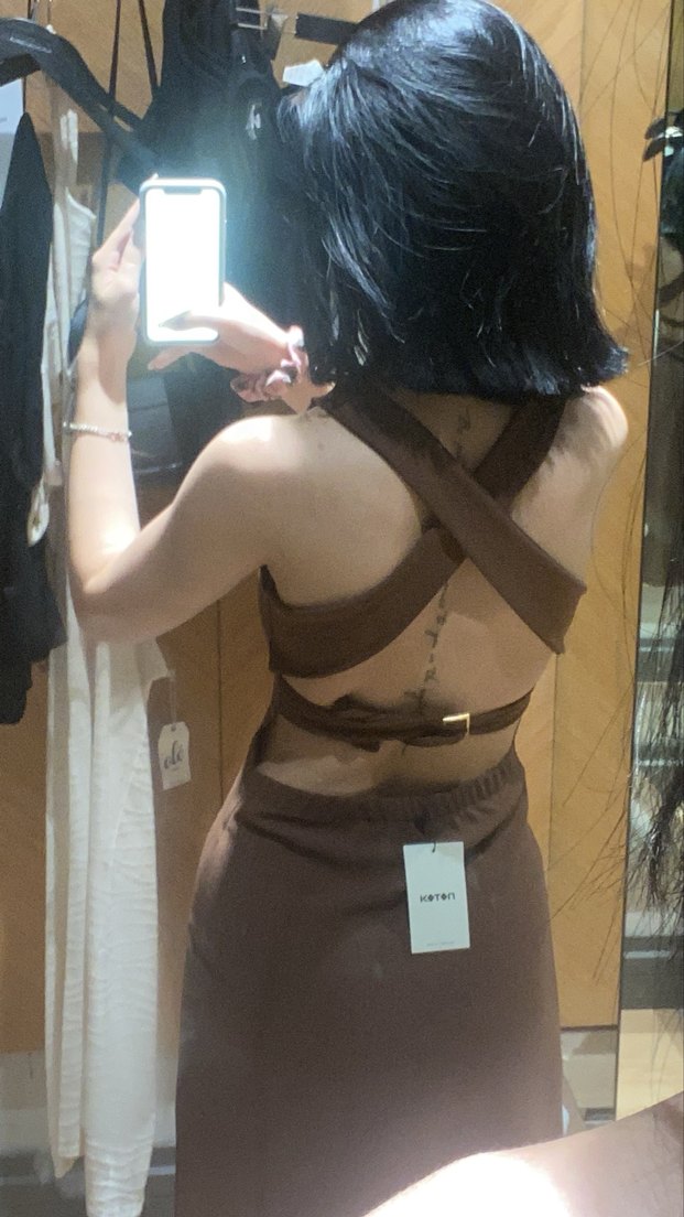Kahverengi deri, halter yakalı ve askılı, tokalı detaylara sahip, sokak tarzı midi elbisedir.