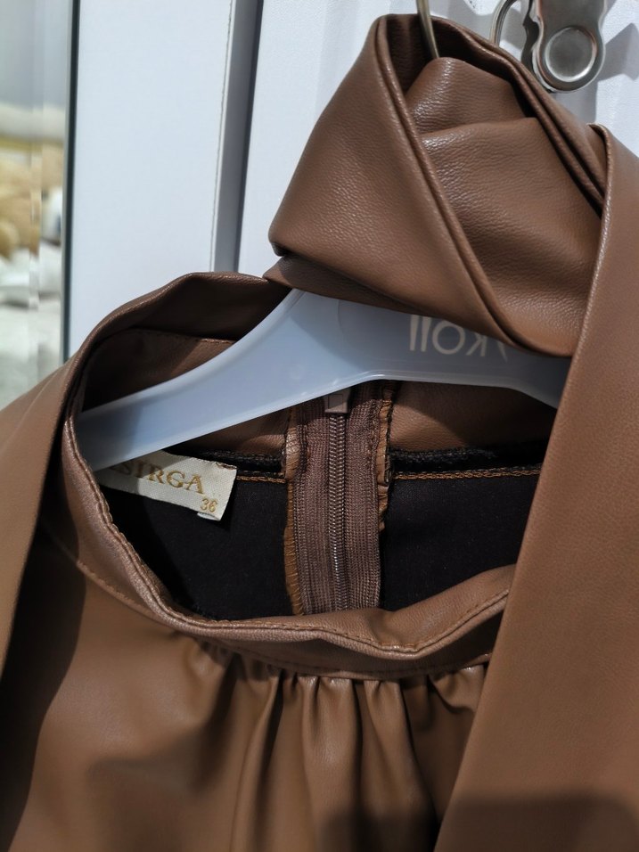 Kahverengi deri ceket, halter yaka ve tokalı detaylarla uzun, fitted kesim sunar. Parlak baskılı desenli, askılı kollu sokak modası tarzında. Marka: RGA.