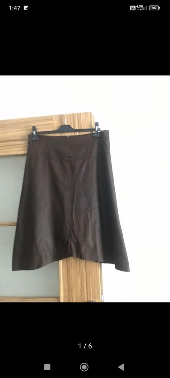 Kahverengi deri midi etek, çan-asimetrik kesim minimalist ve çağdaş bir tarz sunar, ofis için uygundur.