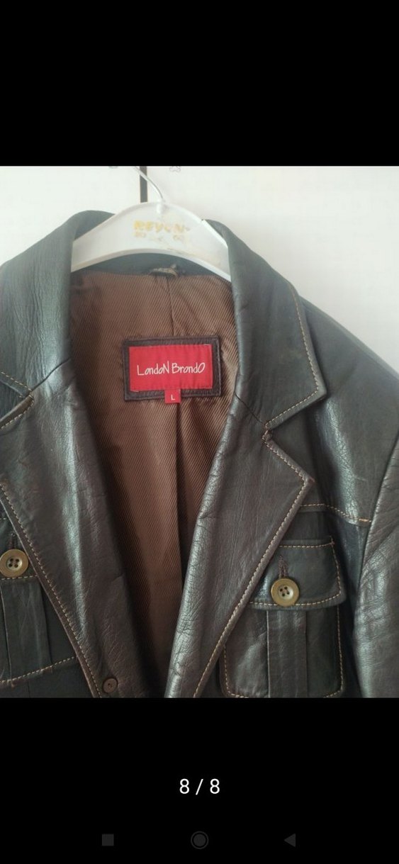 Kahverengi deri erkek biker ceket, düğmeli ve kesik yaka detaylıdır. Uzun kollu, normal midi boyunda ve düzenli kesimdir, ofis kullanımı için uygundur. Desensiz ve Paris tarzı şık bir modeldir.
