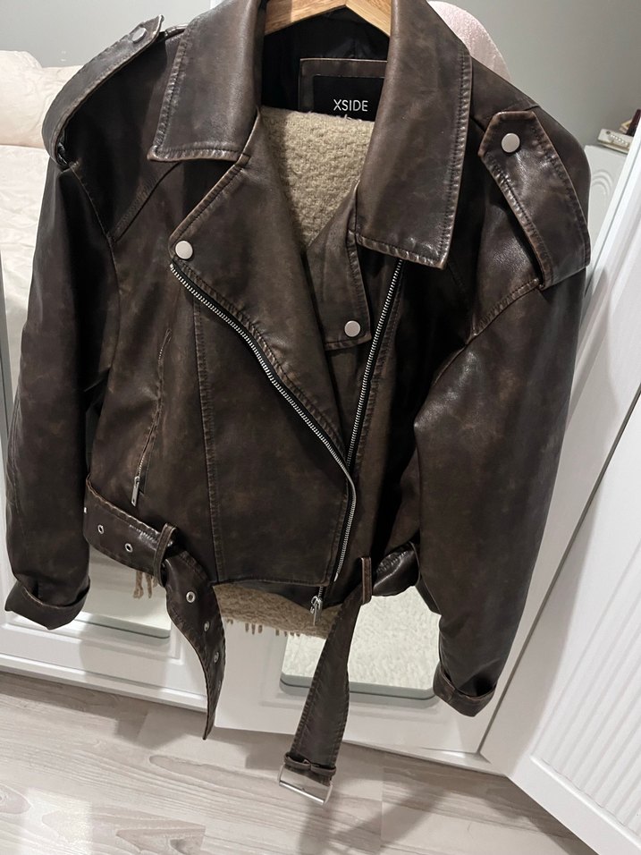 Kahverengi deri biker ceket, notched lapel, tokalı detaylar ve rahat kesim ile günlük kullanıma uygundur. İç kısmı sıcak tutan astarlıdır.