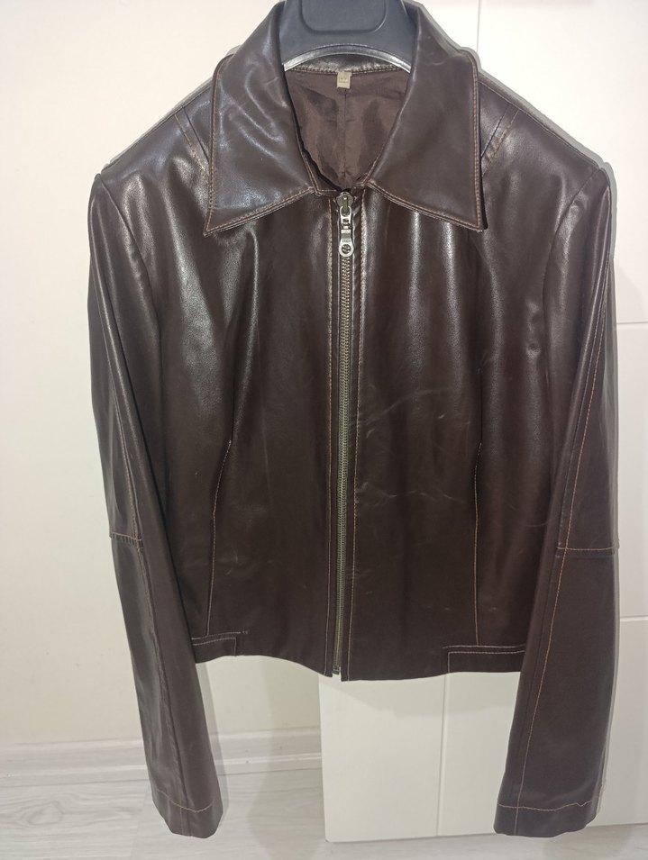 38 beden.kucuk sorunlu yerler fotoğraflandı fiyat ona göre verildi.aci kahve güzel bir renk.iki koltuk altı arası 46 boy 50.inceleyerek alın iade almıyorum. deri, fermuarlı, klasik yaka detaylı kadın biker ceket. Uzun kollu, normal kesim ve günlük kullanıma uygun.