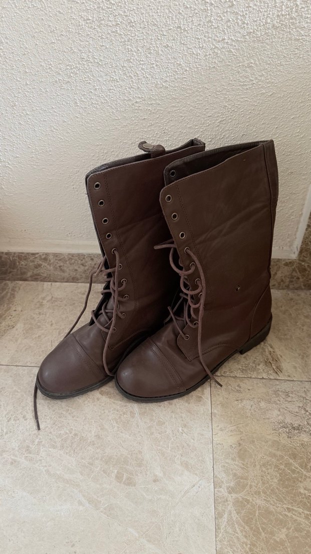 Koyu kahverengi deri kadın botlar, bağcıklı ve tokalı detaylara sahiptir. İnce topuklu ve sade, rahat bohem tarzıyla günlük kullanıma uygundur. Arka kısmında derilerinde çatlama ve soyulma mevcut ama çok göze batmıyor, ister katlayarak ister uzun formda kullanıma uygun 2-3 kez anca kullandım ayağıma küçük geliyor ondan satıyorum.