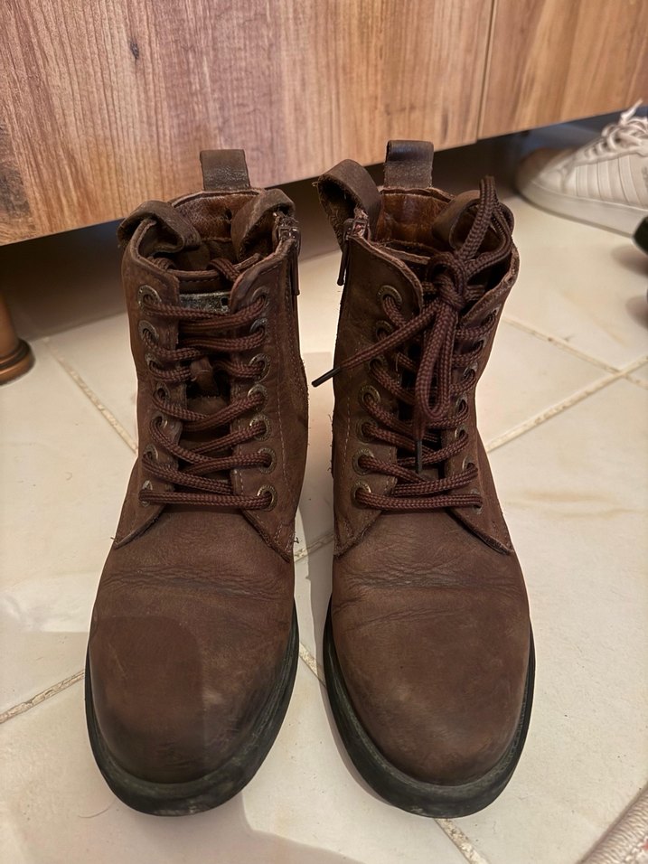 Koyu kahverengi deri kadın bot, tokalı detaylıdır ve günlük kullanıma uygundur. Bağcıklı ve sağlam tabanlıdır.