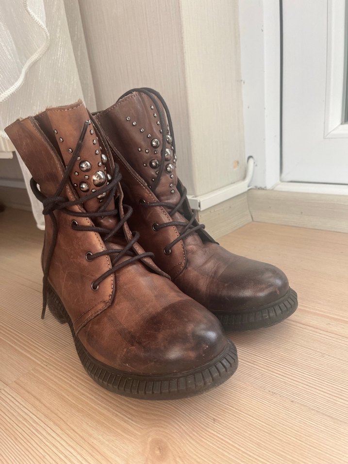 Kahverengi deri kadın botlar, ve tokalı detaylara sahip. Koyu renkte, desensiz ve perçin süslemelidir. Rock punk tarzında, günlük kullanıma uygun. Greyder markadır. #kadınbot #kadınderibot