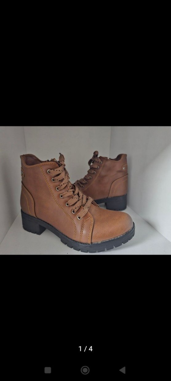 Kahverengi deri kadın bot, kalın topuklu ve bağcıklı. Sokak stili için uygun, günlük kullanıma ideal.